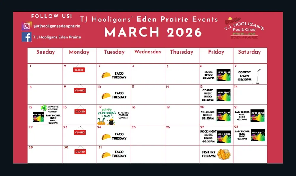 T.J. Hooligan's is Minnesota's home of Music Bingo. Music Bingo is free to play. Everyone gets a bingo card with song names in each box. We play 20-30 seconds of a song, you have to recognize the song and find it on your card. We give out more than 15 prizes each night. It's something you really have to experience in person. We guarantee it will be the most fun you will have all week!