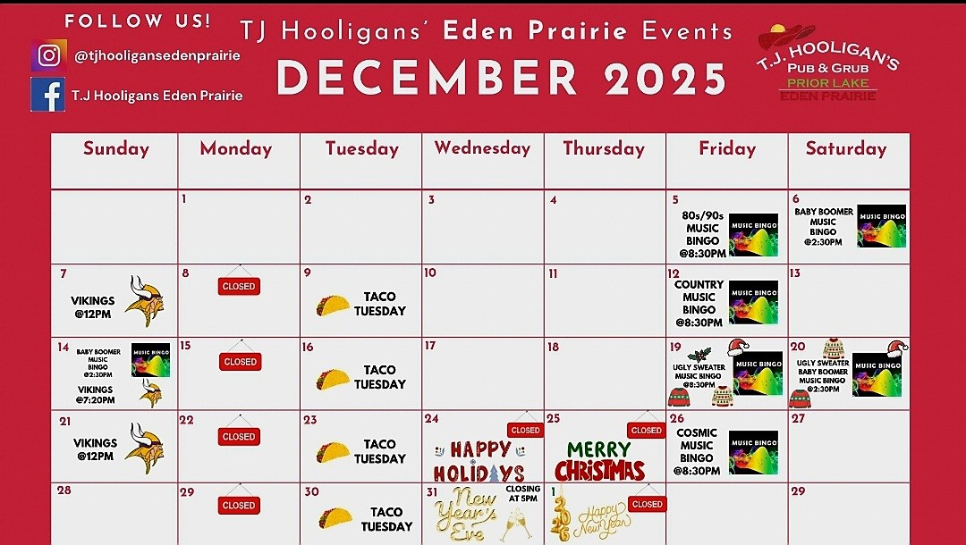 T.J. Hooligan's is Minnesota's home of Music Bingo. Music Bingo is free to play. Everyone gets a bingo card with song names in each box. We play 20-30 seconds of a song, you have to recognize the song and find it on your card. We give out more than 15 prizes each night. It's something you really have to experience in person. We guarantee it will be the most fun you will have all week!